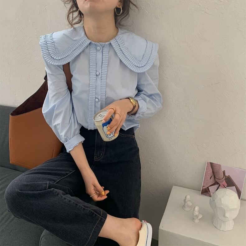 2color ビッグカラー くるみボタン ブラウス プリーツ 襟 大きめ 長袖 シャツ トップス デザイン ホワイト ブルー ペールブルー ペールトーン ニュアンスカラー ニュアンス くすみカラー 大人カラー 白 水色 青 フェミニン ガーリー 春夏 春 夏 上品 オケージョン 対応 お出かけ 大人 女子会 デート ママ コーデ 大人女子 大人かわいい 可愛い かわいい 20代 30代 40代 無地 レディース モード オケージョン対応 清楚 韓国 トレンド モテ