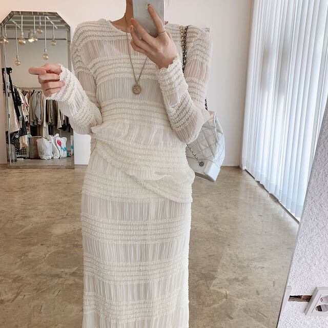 2color レディース セットアップ ロングスカート マキシ丈 ロング丈 ミモレ丈 ミモレ マキシ ロング カットソー スカート トップス ボトムス セット 長袖 タイトスカート 無地 シースルー 薄手 セクシー フェミニン 透け感 シフォン 春夏 春 夏 秋 ママ 20代 30代 40代 デート お出かけ 韓国 トレンド オシャレ おしゃれ お洒落 かわいい 可愛い 大人 大人女子 大人かわいい 大人可愛い