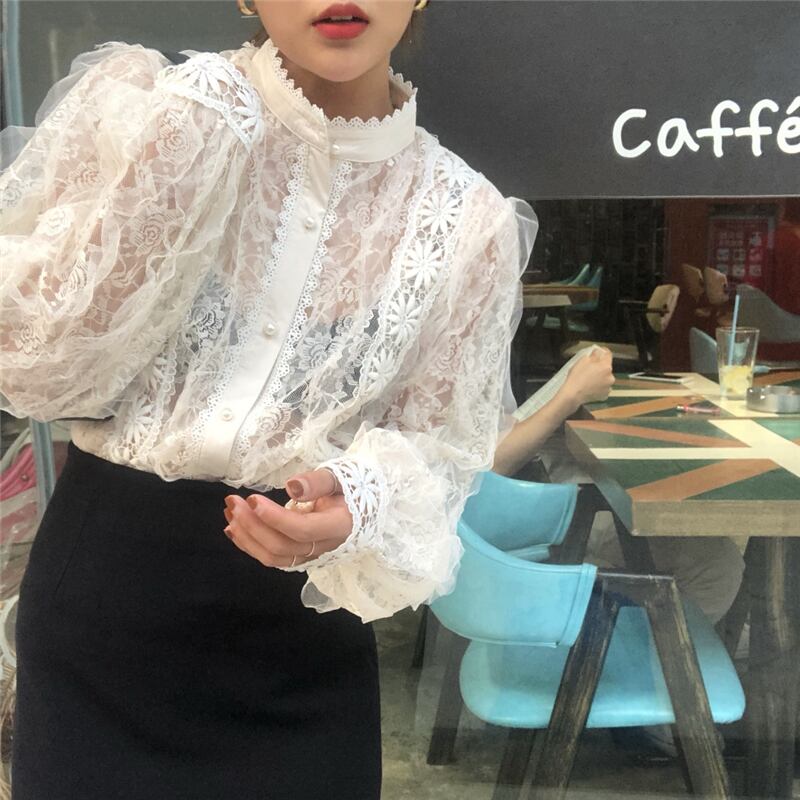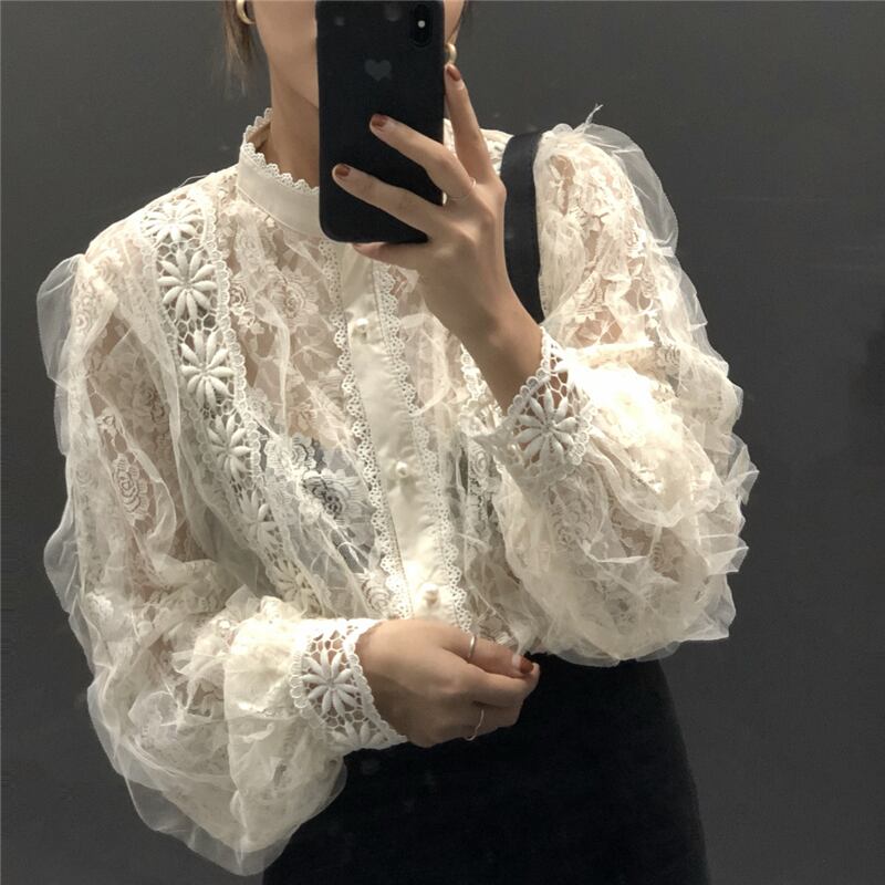 2color レディース トップス 長袖 ブラウス スタンドカラー 襟なし ボリューム袖 レース シフォン チュール シアー シアーブラウス 透け感 華やか ホワイト ベージュ ブラック 白 黒 おしゃれ オシャレ お洒落 春夏 春 夏 秋冬 秋 ママ ママコーデ 20代 30代 40代 デート お出かけ 普段使い 韓国 トレンド かわいい 可愛い 大人 大人女子 大人かわいい 大人可愛い オフィス 仕事 通勤 通学 ドレス フォーマル