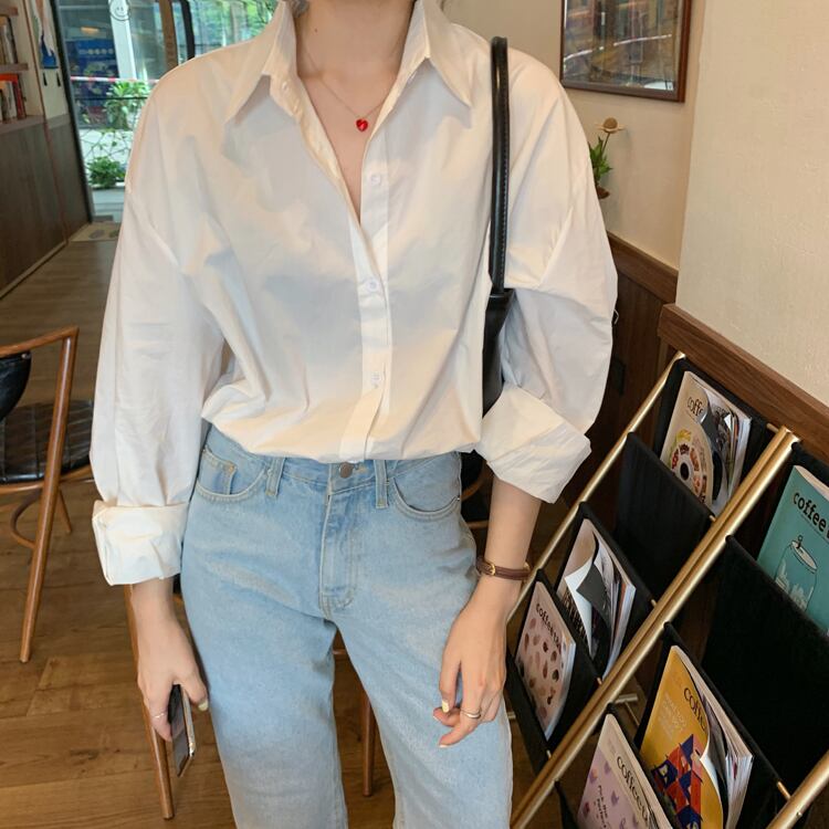 コーディネートしやすい白シャツでゆったりとしたドルマンスリーブ。