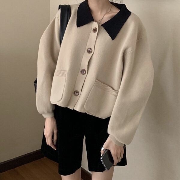 3color レディース トップス ニット カーディガン 襟付き 襟あり 長袖 ショート ショート丈 ゆったり ボリューム袖 ポケット付き フロントボタン バイカラー レトロ カジュアル おしゃれ オシャレ お洒落 春夏 春 秋冬 秋 冬 ママ ママコーデ 20代 30代 40代 デート お出かけ 普段使い デイリー 韓国 トレンド かわいい 可愛い 大人 大人女子 大人かわいい 大人可愛い 海外 旅行 海外旅行