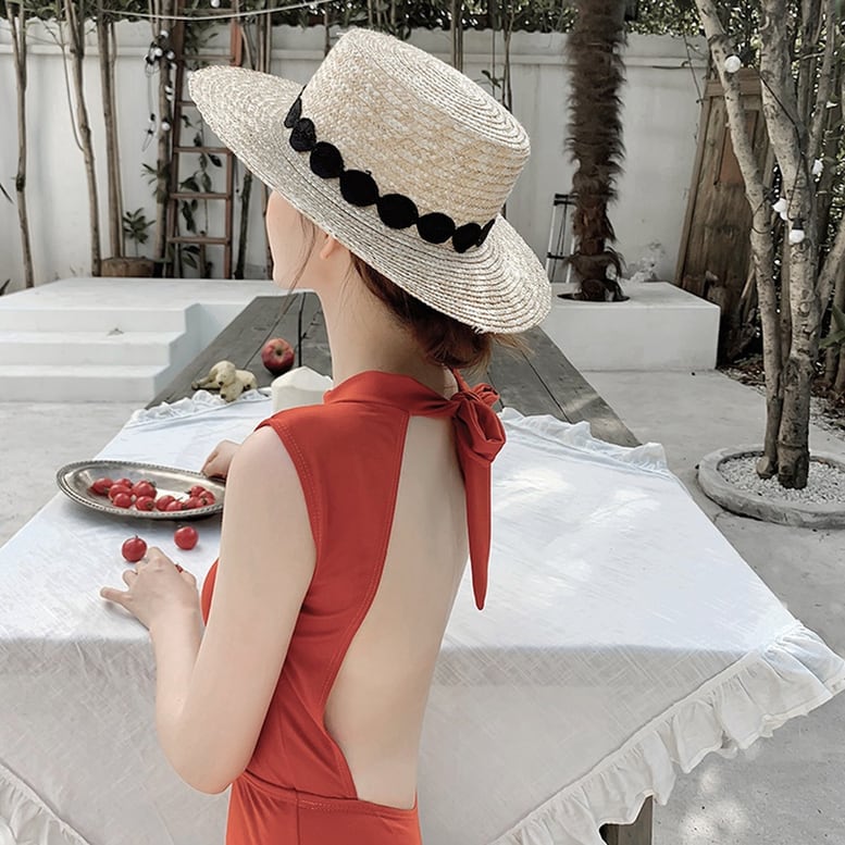 バックリボンに広くあいた背中がアクセントのワンピース水着。