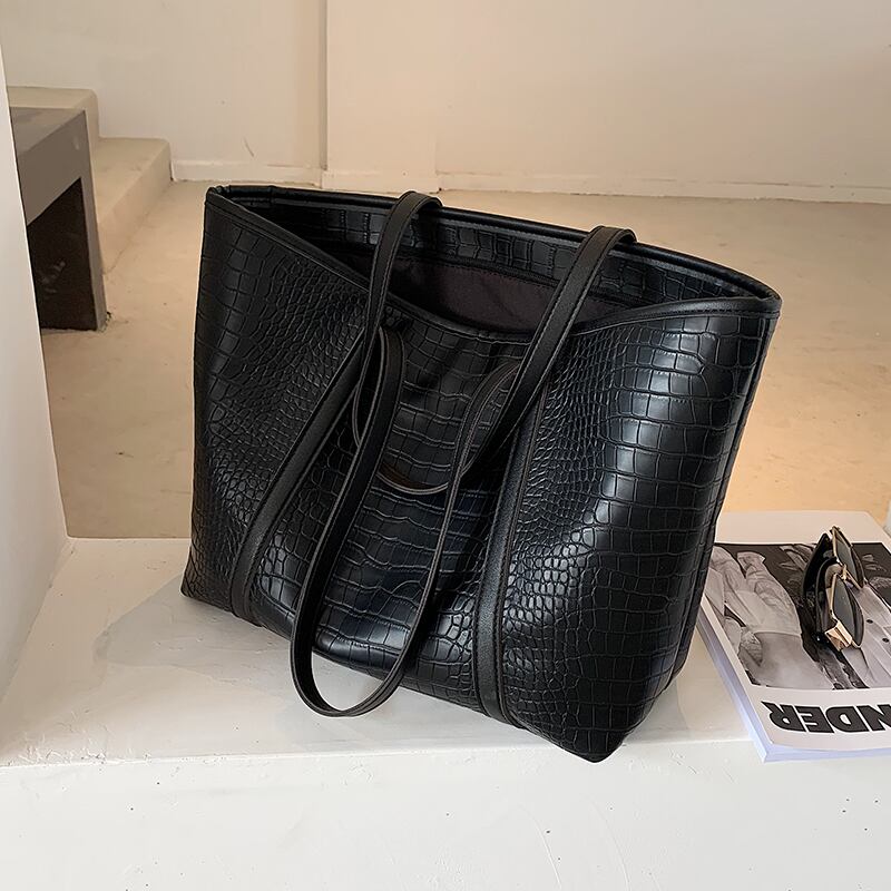クロコダイル型押しのスタイリッシュなフェイクレザートートバッグ。