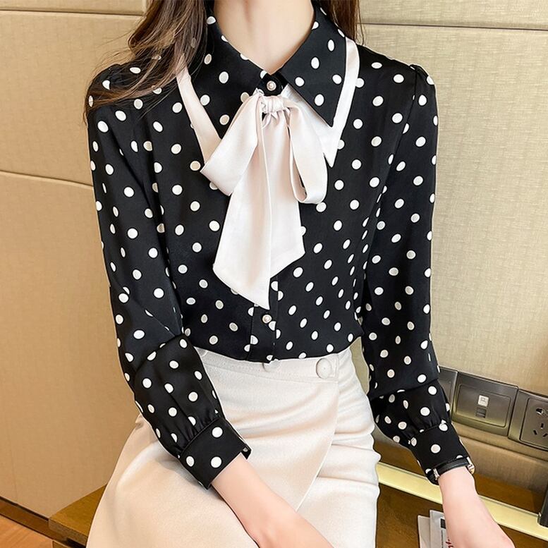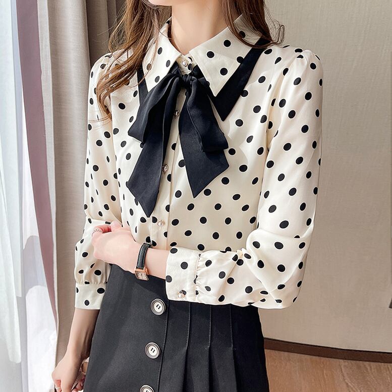 2color レディース ドット柄リボン付長袖シャツ トップス シャツ ブラウス 白シャツ 白トップス 長袖 襟付き リボン 大人可愛い きれいめ 上品 レトロ 大人女子 こなれ感 キュート ガーリー エレガント 存在感 とろみ 白 ホワイト 黒 ブラック 光沢 ドット柄 入学式 入園式 卒業式 卒園式 謝恩会 披露宴 おしゃれ オシャレ お洒落 春夏 春 夏 オフィス 仕事 通勤 通学 パーティー 二次会 フォーマル ドレス デート お出かけ 普段使い 大人 かわいい 可愛い トレンド