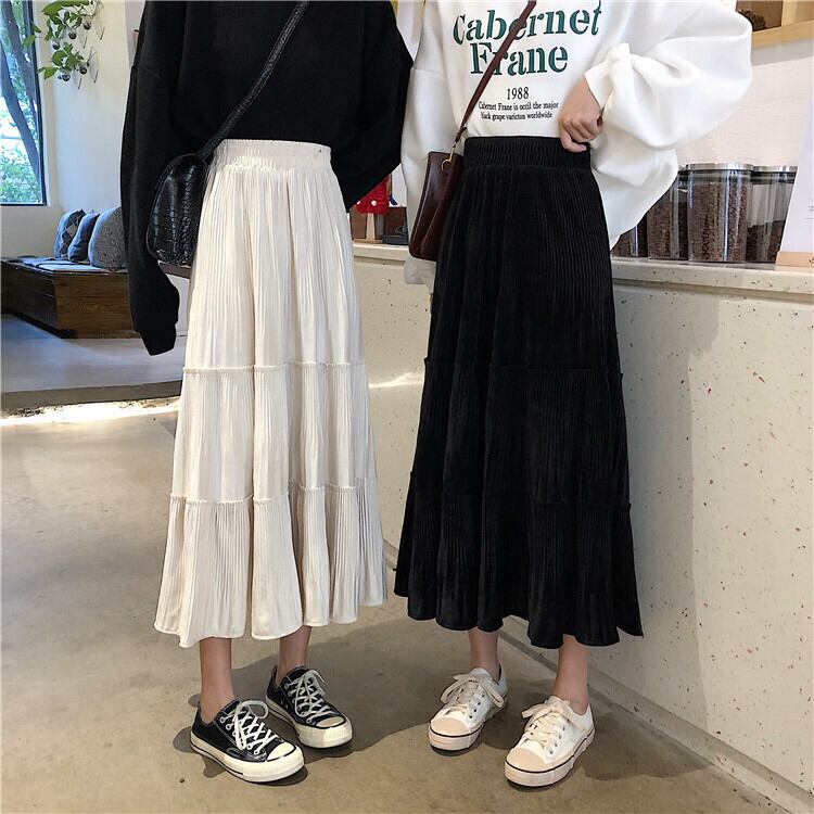 トレンドのプリーツに切り替えのフレアデザインがおしゃれなデザインのロングスカートです。