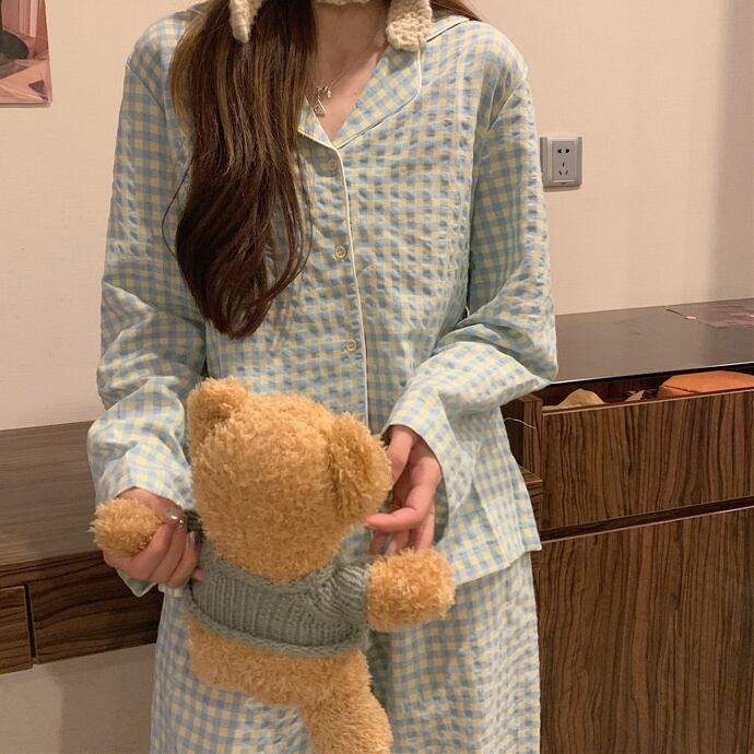 2color レディース ルームウェア パジャマ 部屋着 セット 上下セット Vネック シャツ 長そで 長袖 長ズボン ロングパンツ チェック チェック柄 定番 ベーシック リラックス ゆったり パープル ブルー 爽やか おしゃれ オシャレ お洒落 春夏 春 夏 秋冬 秋 冬 ママ ママコーデ 20代 30代 40代 デート 普段使い 韓国 トレンド かわいい 可愛い 大人 大人女子 大人かわいい 大人可愛い 海外 旅行 海外旅行 オフ 休日 お揃い ペア