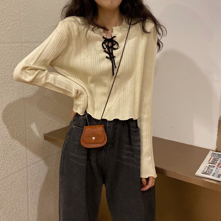 ネックのレースアップがポイントになったランダムリブのトップス。