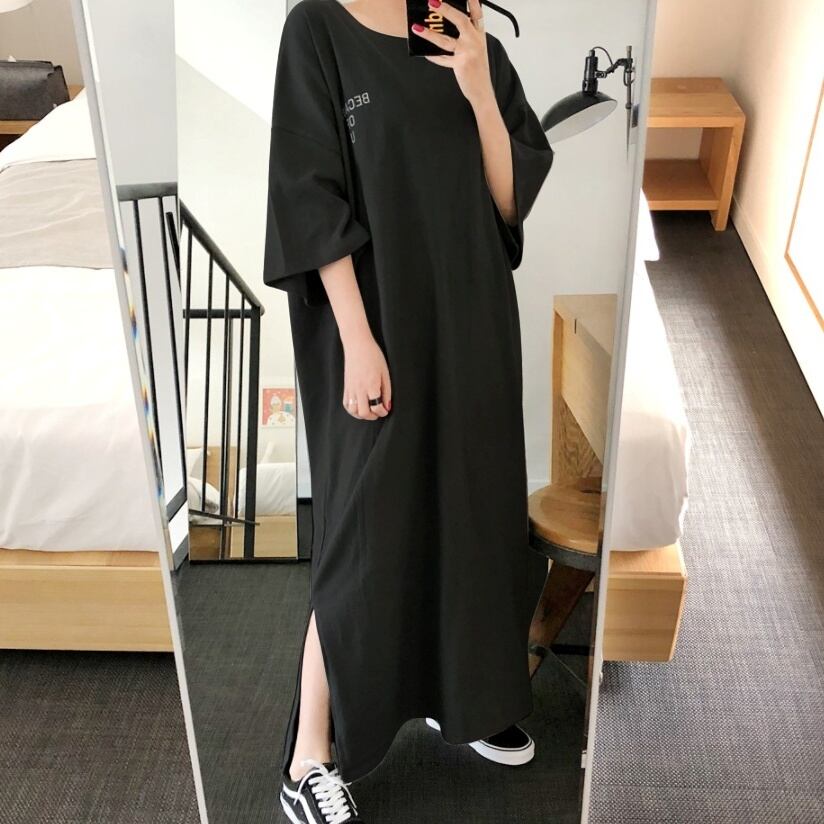 2color レディース ワンピース ロングワンピース 半袖 ラウンドネック ロゴ ロゴ入り バックプリント スリット スリット入り オーバー ゆったり リラックス ラフ カジュアル 大人カジュアル メンズライク ストリート 体型カバー おしゃれ オシャレ お洒落 春夏 春 夏 秋冬 秋 冬 ママ ママコーデ 20代 30代 40代 デート お出かけ 普段使い 韓国 トレンド かわいい 可愛い 大人 大人女子 大人かわいい 大人可愛い オフ 休日 デイリー 海外 旅行 海外旅行 通学