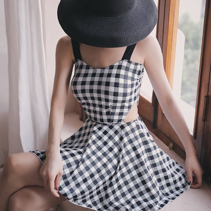 モノトーンの大人可愛いギンガムチェックのワンピース水着。
