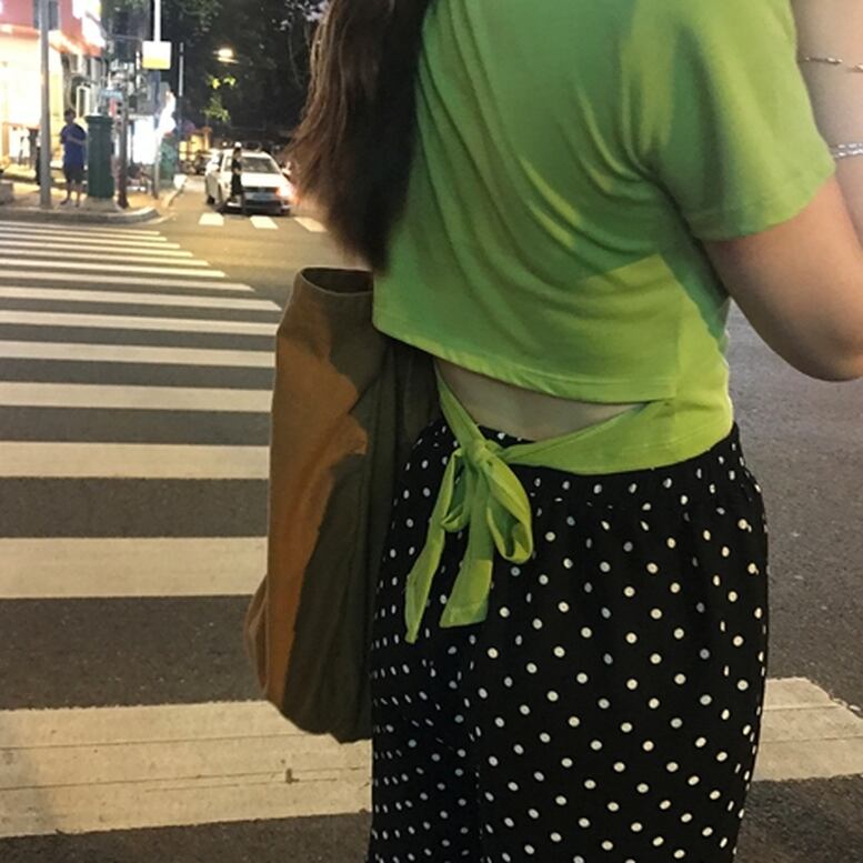 前から見るとベーシックですが後ろはリボンで結べるデザインになっているTシャツ。