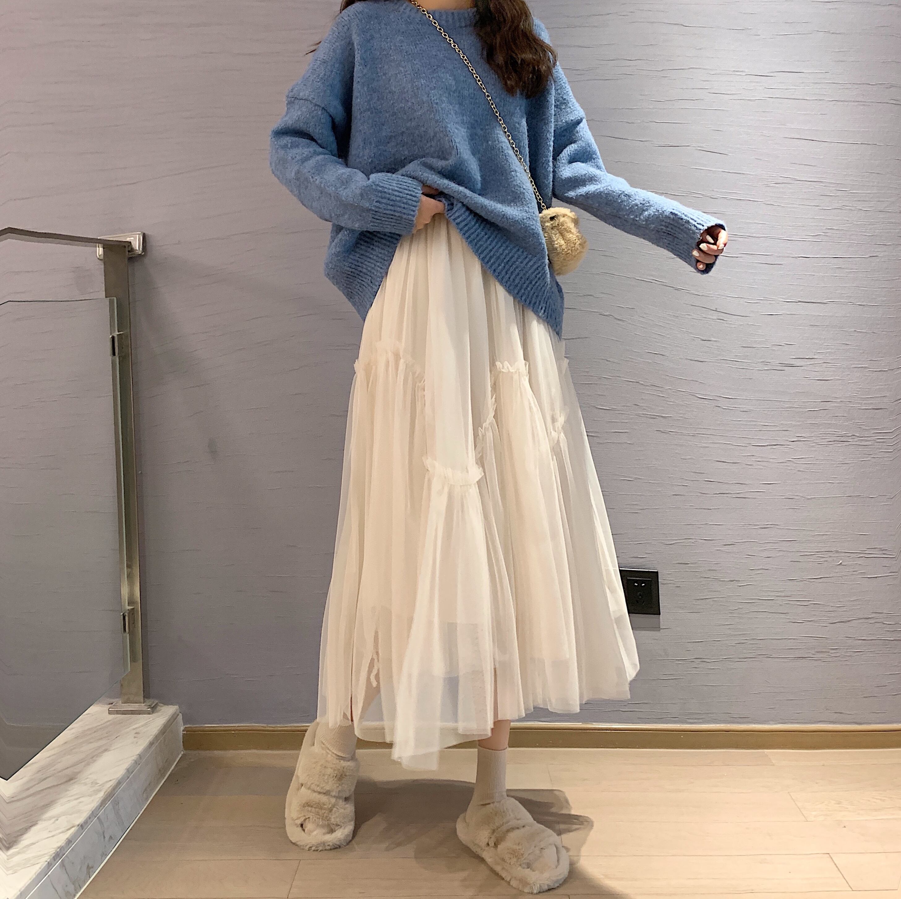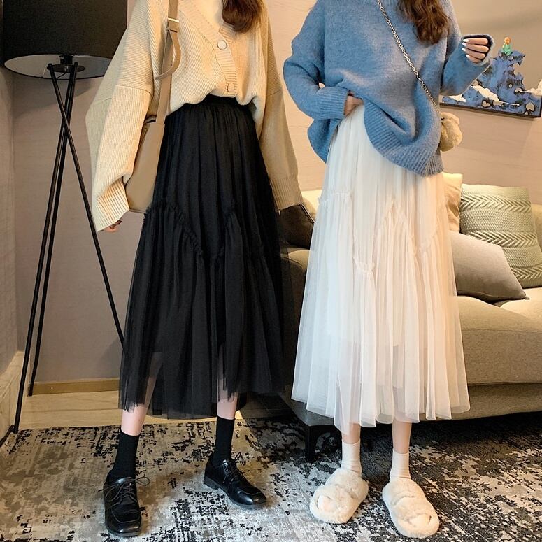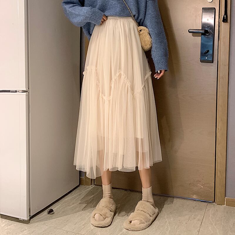 ウェーブの切り替えデザインがオシャレなチュールロングスカート。