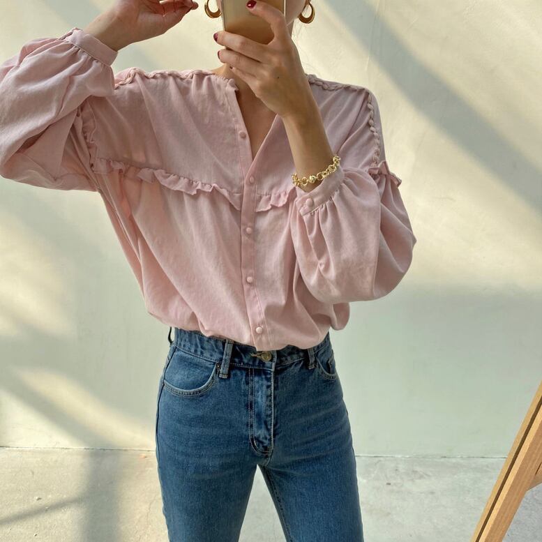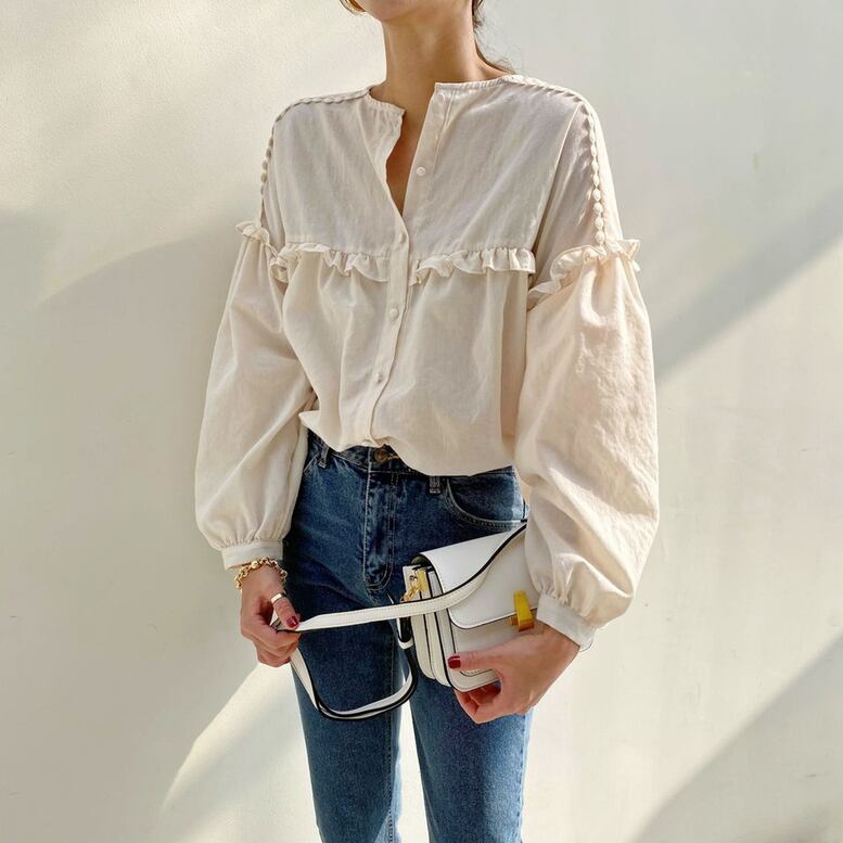 胸元と腕周りにフリルが施されたフェミニンブラウス。