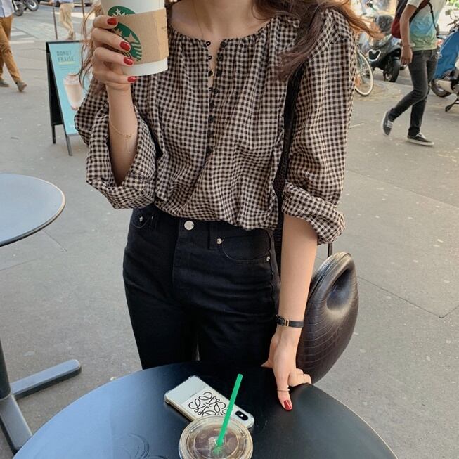 レディース トップス ブラウス シャツ プルオーバー ラウンドネック シフォン 上品 カットソー 前ボタン 長袖 大人可愛い きれいめ 上品 レトロ 大人女子 キュート ガーリー 格子 茶 チェック モテ 体型カバー おしゃれ オシャレ お洒落 春夏 春 夏 秋 オフィス 仕事 通勤 通学 お出かけ 普段使い 大人 かわいい 可愛い トレンド カジュアル ブラウン ゆったり ラフ こなれ感