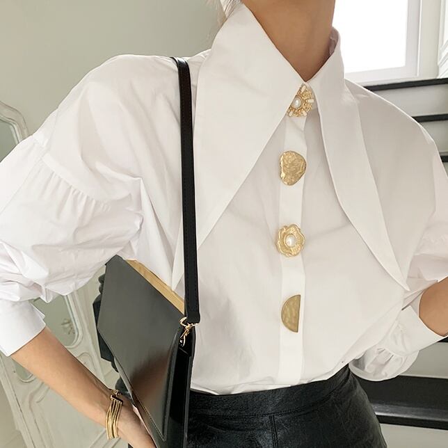 レディース トップス ブラウス シャツ ホワイトシャツ ピューリタンカラー 金具 ゴールド ドロップショルダー ボリューム袖 パフスリーブ 長そで 長袖 9分丈 クール 大人カジュアル キレイめ きれいめ スタイリッシュ モード系 個性的 存在感 おしゃれ オシャレ お洒落 春夏 春 夏 秋冬 秋 冬 ママ ママコーデ 20代 30代 40代 デート お出かけ デイリー 普段使い 韓国 トレンド かわいい 可愛い 大人 大人女子 大人かわいい 大人可愛い 海外 旅行 海外旅行 オフィス 仕事 通勤 通学