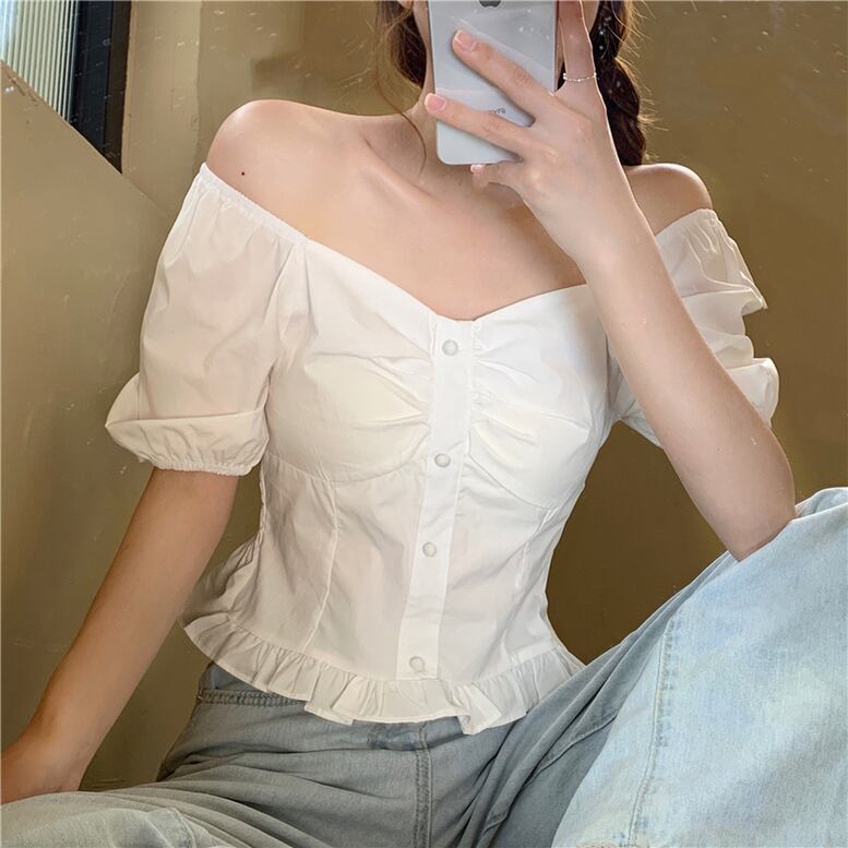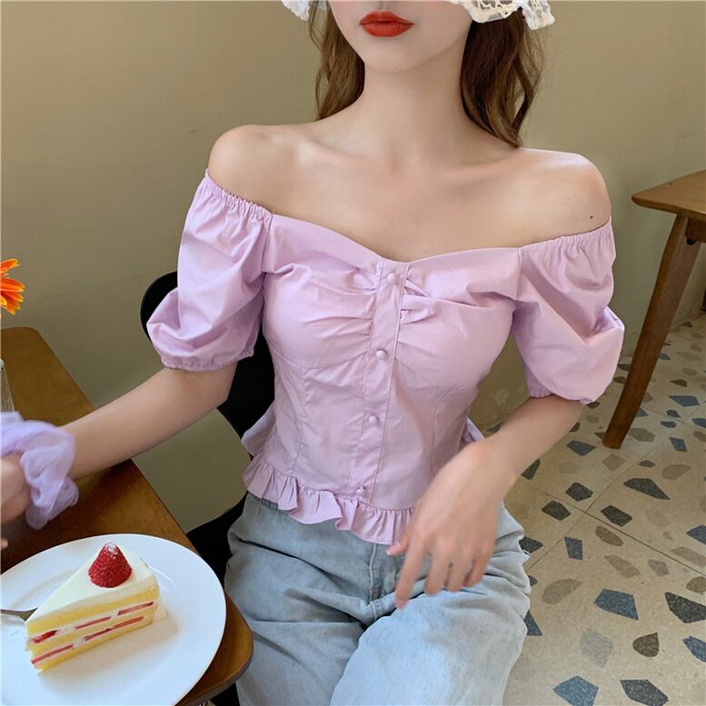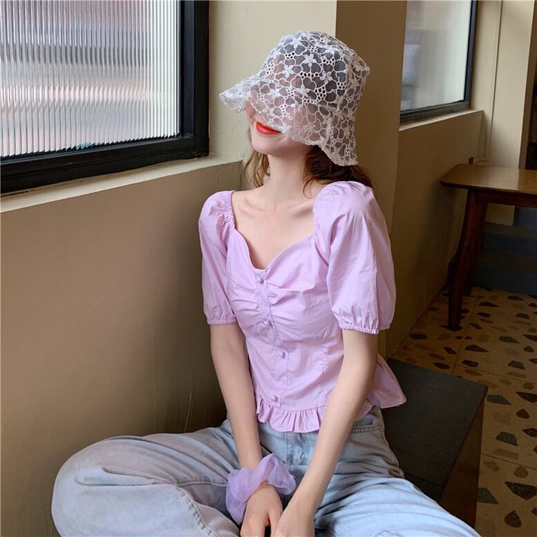 3color レディース フロントボタンパフスリーブフリルブラウス トップス シャツ ブラウス カットソー 白シャツ 白トップス ミニ ショート丈 袖あり 半袖 パフスリーブ スクエアネック フリル 大人可愛い きれいめ 上品 レトロ 大人女子 こなれ感 キュート ガーリー 白 ホワイト ブルー パープル ニュアンスカラー モテ インスタ映え おしゃれ オシャレ お洒落 春夏 春 夏 秋冬 オフィス 仕事 通勤 通学 二次会 デート お出かけ 普段使い 大人 かわいい 可愛い トレンド