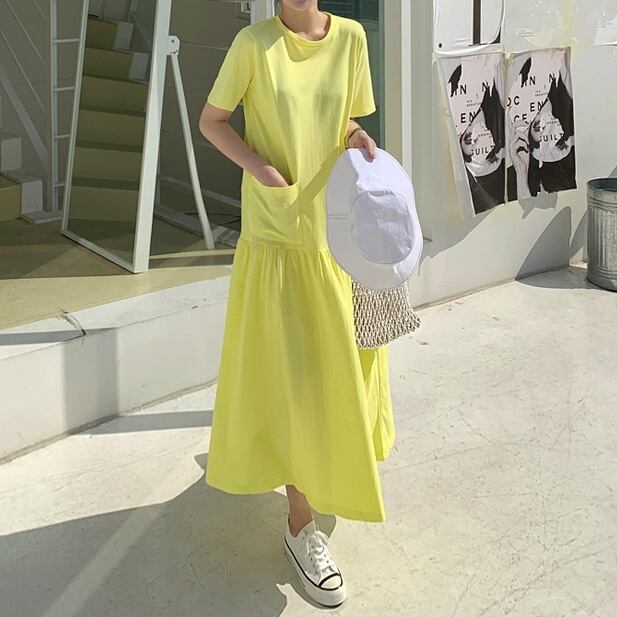 イエローカラーがさわやかな印象を与えてくれる大人可愛いロングワンピース。