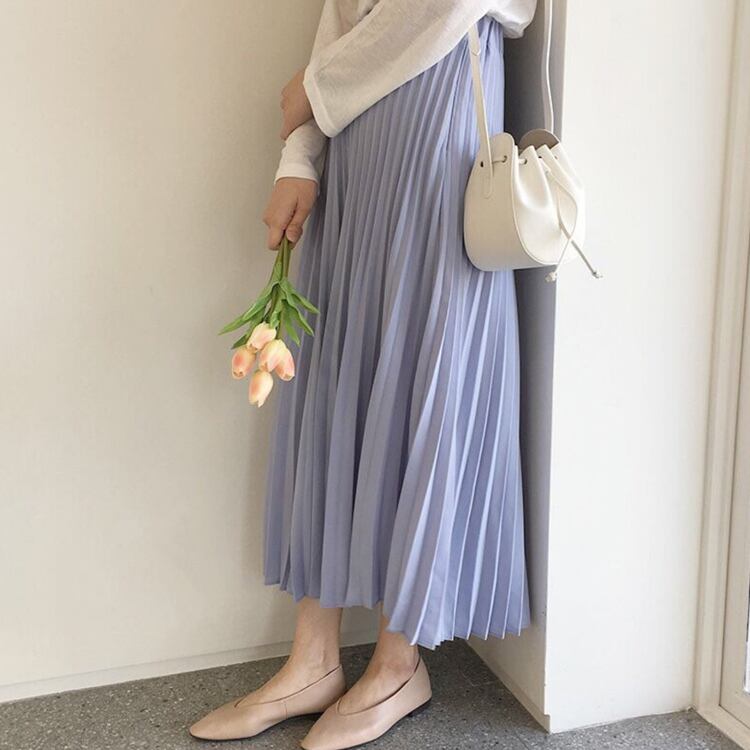 さわやかなカラーがフェミニンで女性らしいプリーツロングスカート。