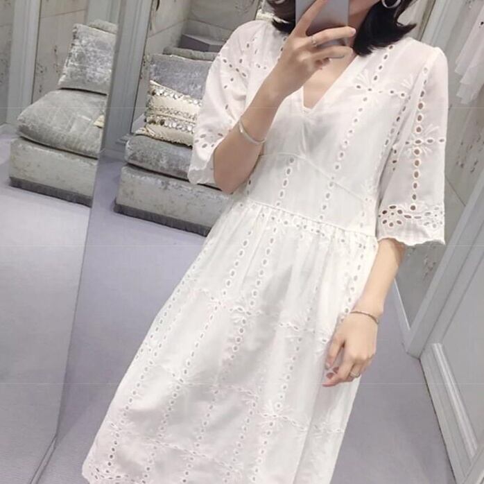 爽やかなホワイトカラーでレースデザインが目を引くロングワンピース。
