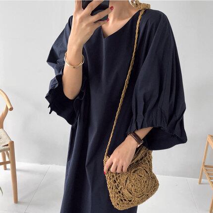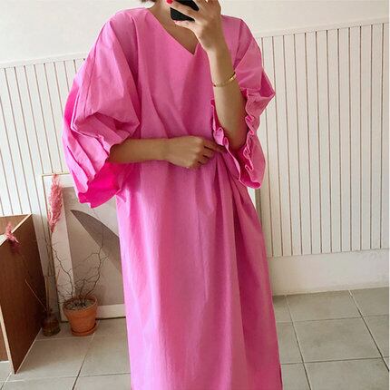 2color レディース ワンピース ミモレ ミモレ丈 袖あり 半袖 5分袖 五分袖 ボリューム袖 Vネック 襟なし ワイド プリーツ サイドスリット ポリエステル 薄手 かわいい 大人可愛い シンプル カジュアル 大人 上品 おしゃれ お洒落 大人可愛い 大人女子 ラフ S M L XL ゆったり ゆる 黒 ブラック ピンク 無地 春 夏 秋 10代 20代 30代 40代 デート お出かけ 女子会 お泊まり 休日 着回し 普段使い 重ね着 ファッション コーデ スタイル 体系カバー