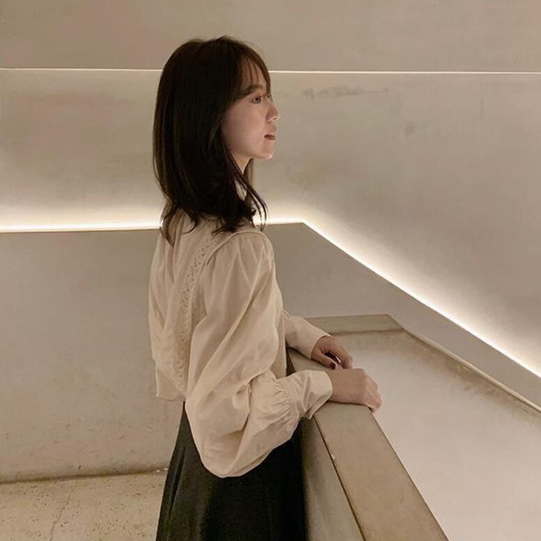 ネックと両サイドにあしらったレーステープが華やかなブラウス