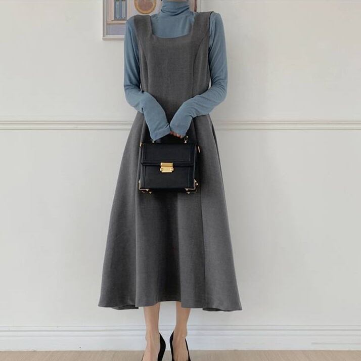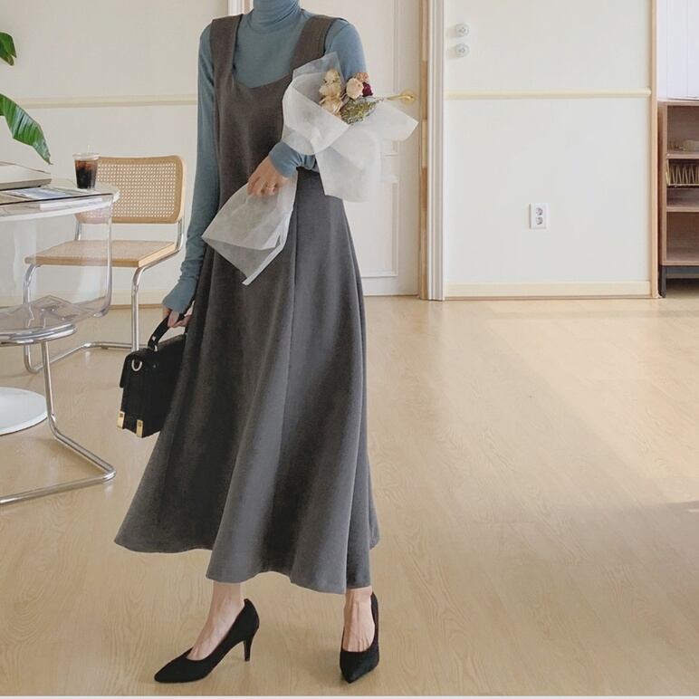 ロング丈のスッキリとしたワンピースとハイネックのトップス。