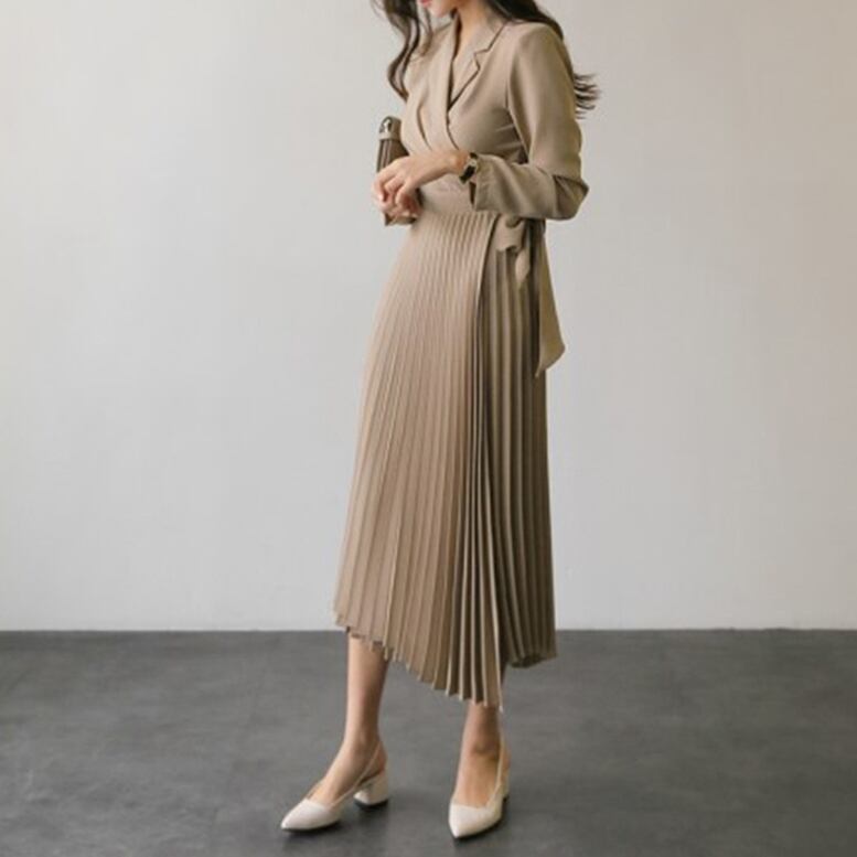 プリーツの切り替えが華やかなウエストリボンロングワンピース。マーメイドラインの総プリーツスカートが絶妙な前後差のヘムラインで洗練されたシルエットを形成。胸元はカシュクール風にタックをよせて大人の装いへ導きます。