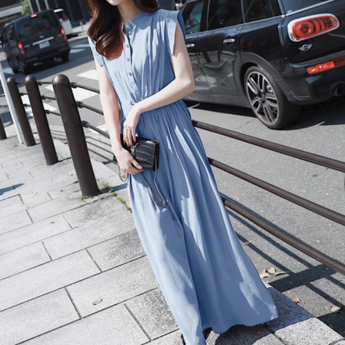 レディース ワンピース ロングワンピース ロング丈 ロング マキシ マキシ丈 アンクル丈 フレンチスリーブ スタンドカラー ウエストリボン リボン 前りぼん フロントボタン ボタン 襟なし ブルー 爽やか カジュアル 大人カジュアル きれいめ キレイめ 清楚 キュート エレガント 上品 おしゃれ オシャレ お洒落 春夏 春 夏 秋 秋冬 ママ 20代 30代 40代 デート お出かけ 普段使い 韓国 トレンド かわいい 可愛い 大人 大人女子 大人かわいい 大人可愛い 休日 オフ 通学 通勤 仕事