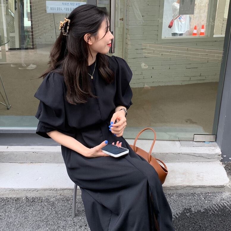 独特のタック袖にシアーなスカートがエレガントなロングワンピース。ギャザー入りの袖パフデザインがフェミニンな1枚。デートコーデにおすすめな上品で女性らしいアイテムです。