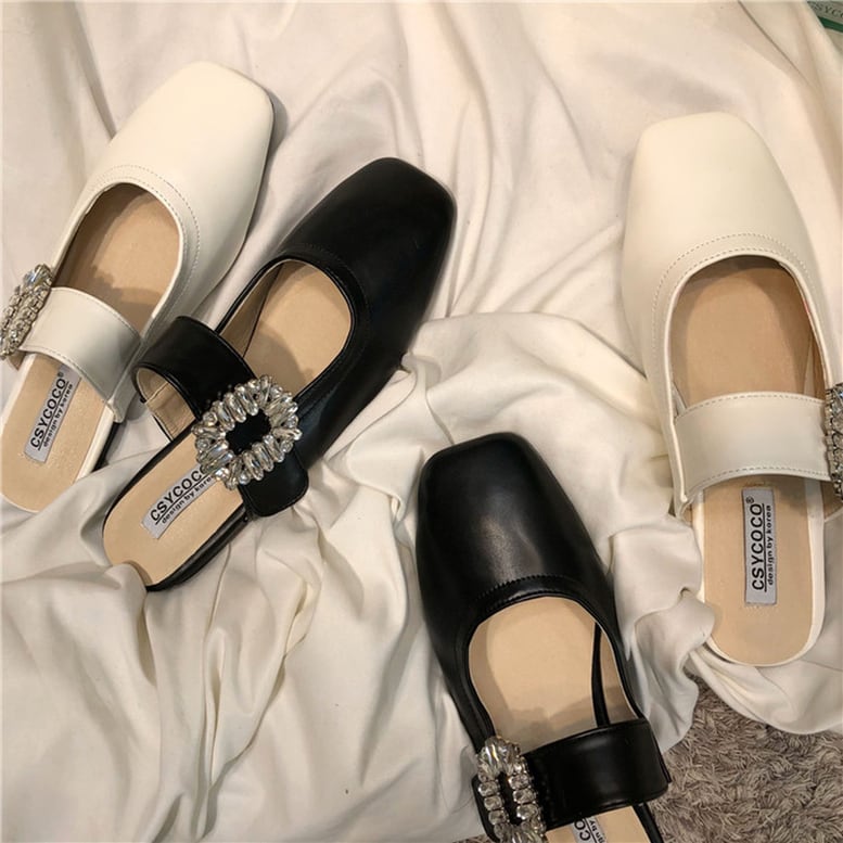 スクエアのビジューストラップが目を惹くシューズ。パンプス見えするフォルムで大人のリュクス感を演出。歩きやすいフラットソールで幅広ベルトが甲をしっかりホールド