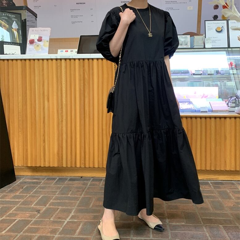 レディース ティアードワンピース ボリュームスリーブマキシワンピース ワンピース ドレス dress シャツワンピース フレアワンピース ティアードワンピース ワンピドレス ロング丈 マキシ 半袖 ボリューム袖 パフスリーブ クルーネック 切り替えデザイン フレア エレガント 大人可愛い きれいめ 華やか 上品 レトロ クラシック キュート ガーリー 黒 ブラック お呼ばれ 謝恩会 演奏会 発表会 体型カバー 二の腕カバー モテ 高見え 格上げ インスタ映え おしゃれ 春 夏 パーティー デート トレンド