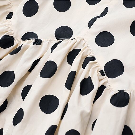 全体的にふわりとしたデザインと大きめなドット柄が目を引く1着。お買い物 お出かけ デートなど多方面に大活躍!
