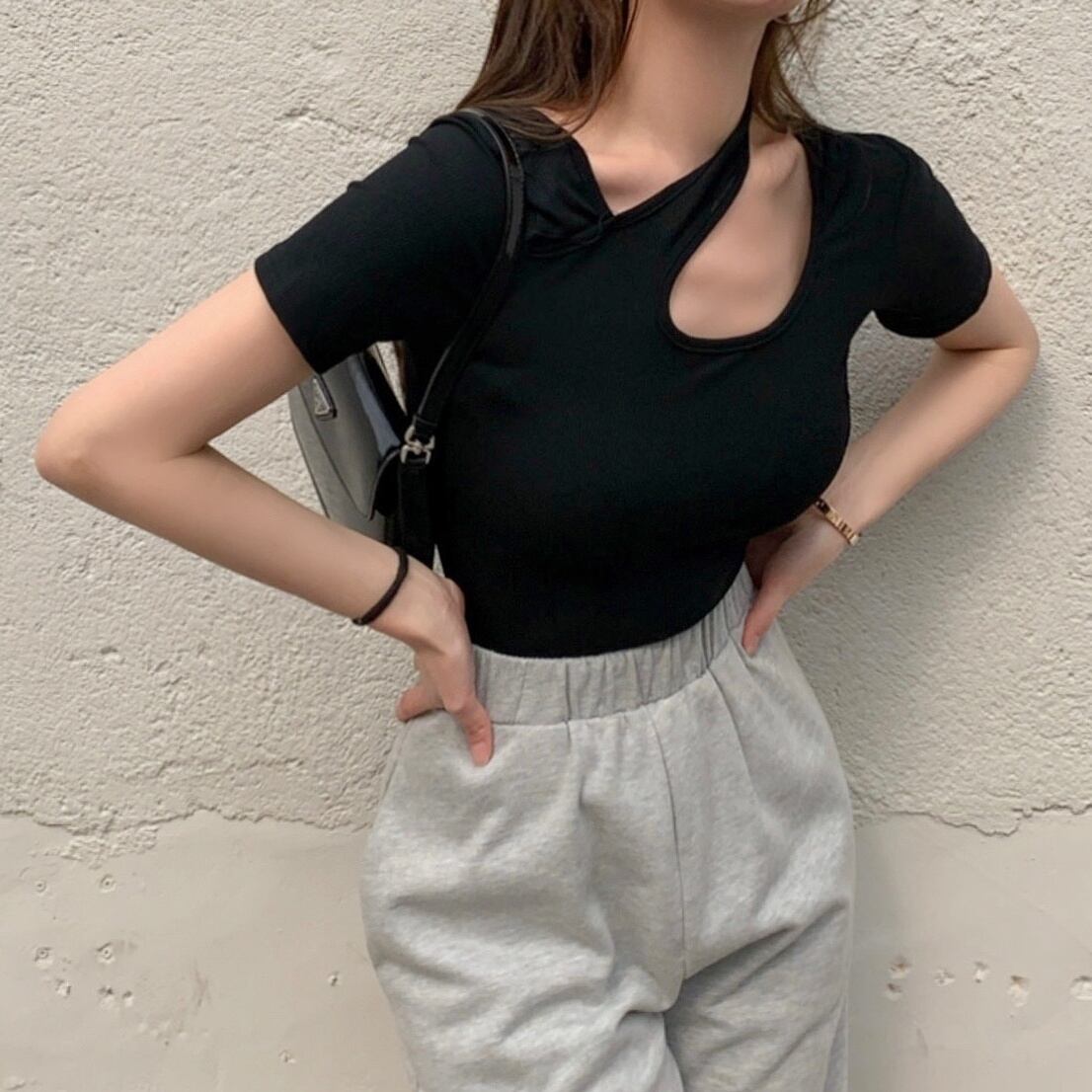 2color レディース トップス Tシャツ カットソー 半そで 半袖 デザイン ネック ショルダーストラップ 個性的 アシメ アシンメトリー フィット タイト 無地 白 ホワイト 黒 ブラック おしゃれ オシャレ お洒落 春夏 春 秋冬 秋 ママ ママコーデ 20代 30代 40代 デート お出かけ 普段使い デイリー 韓国 トレンド かわいい 可愛い 大人 大人女子 大人かわいい 大人可愛い 国内 海外 旅行 海外旅行 通学 オフ 休日