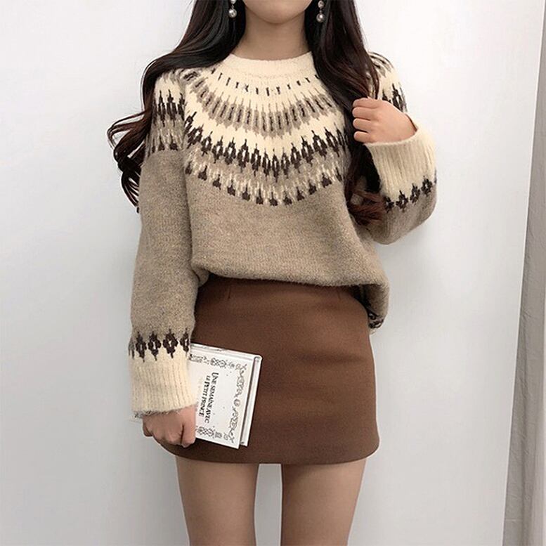 華やかなフェアアイル柄が目を惹きつけるニットプルオーバー。パステル調の色使いで幾何学模様が数段に渡っている求心柄がレトロな印象です。ゆったりしながらもコンパクトに見せてくれる可愛いアイテム
