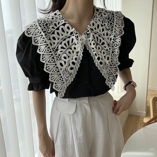 2color レディース トップス ブラウス 半袖 パフスリーブ 襟付き レース襟 前開き モノトーン 大人カジュアル こなれ感 きれいめ キレイめ 清楚 キュート 上品 エレガント おしゃれ オシャレ お洒落 春夏 春 夏 秋 冬 ママ 20代 30代 40代 デート お出かけ 普段使い 韓国 トレンド かわいい 可愛い 大人 大人女子 大人かわいい 大人可愛い 休日 オフ 通学 仕事 通勤 オフィスカジュアル オフィスコーデ 通勤コーデ お仕事コーデ