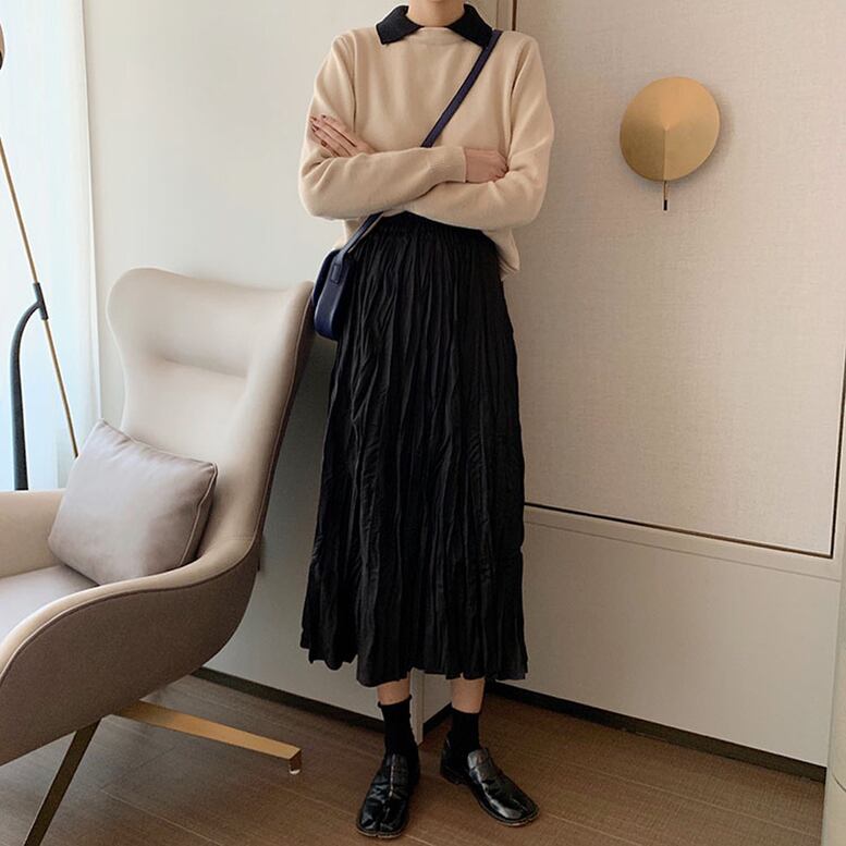 ナチュラル感のあるワッシャー加工をかけた上品なプリーツスカート。少し光沢をつけて表情のある1枚に仕上げました。ウエストはゴム仕様で気楽に使えるしわ感なのでデイリーにおすすめです