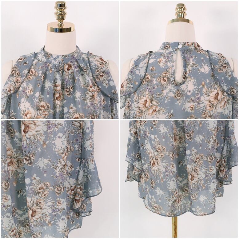 肩のカットアウトと袖のフリルが大人フェミニンなブラウス。フローラルプリントが女性らしい雰囲気漂うアイテムです。エレガントなスカートコーデもカジュアルなボトムでMIXしても可愛い一品