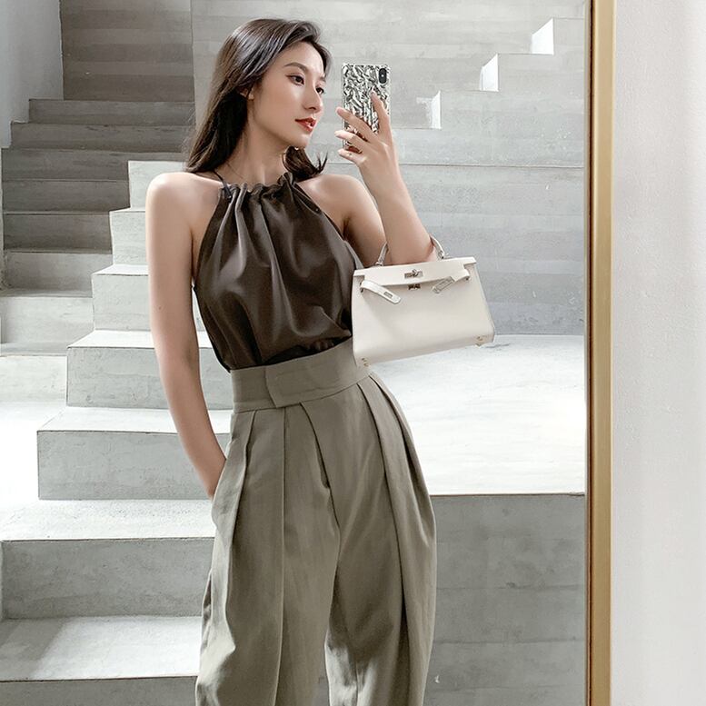 サテンの上品な艶を楽しめるキャミブラウス。タックをかけることで光沢に動きが出てデザインと楽しめる1枚。すっきりした肩回りでヘルシーな肌見せがスタイリッシュな雰囲気を演出します