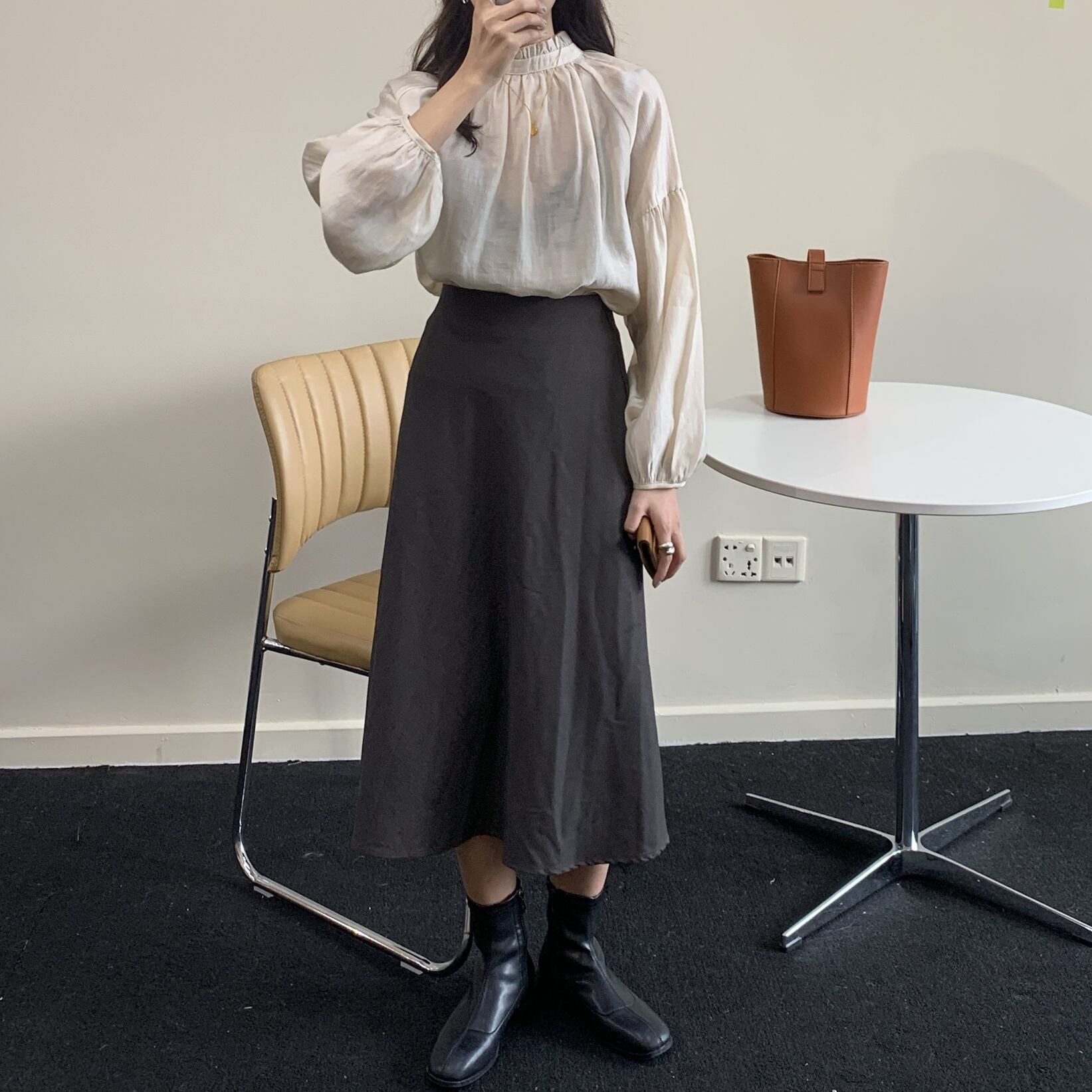 スタンドカラーできっちり感、ボリューム袖でフェミニンな印象を与えてくれる大人可愛いトップス。