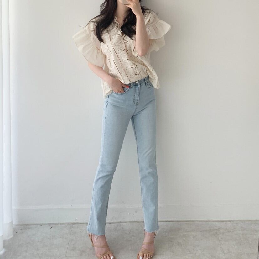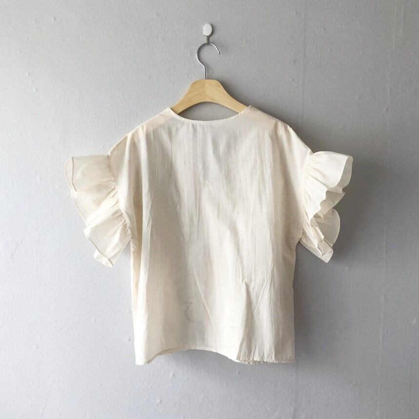 すっきりとしたVネックに、スカラップレースがフェミニンな印象のブラウスです。