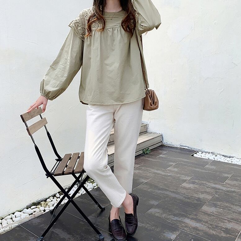 肩を覆うカットワークレースのフリルがポイントのブラウス。フレアシルエットが可愛いガーリーな1枚。ボトムインしたラフなスタイリングもおすすめです