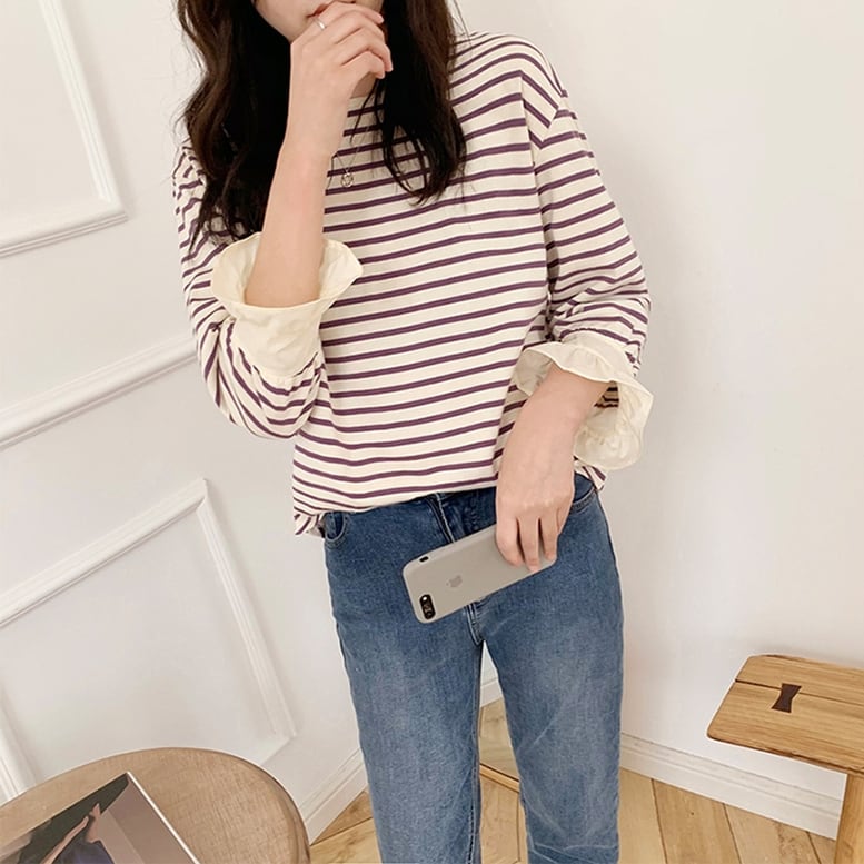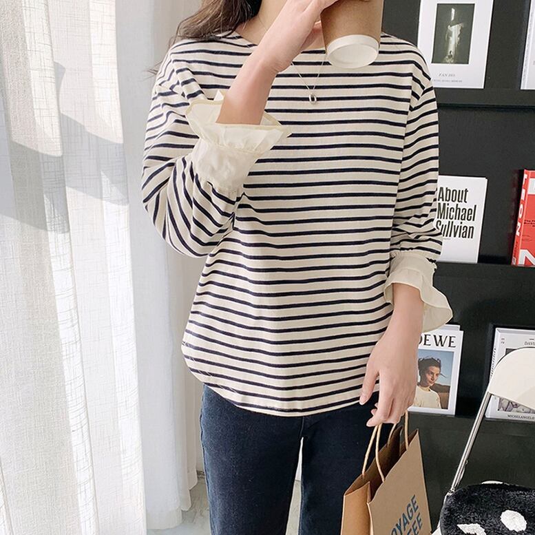 定番のボーダーにアレンジを効かせた袖のフリルが可愛いトップス。デイリーにも使いやすい素材感でカジュアルにもフェミニンにもコーデができます。アクセサリーを合わせて女性らしさを高めるのもおすすめです