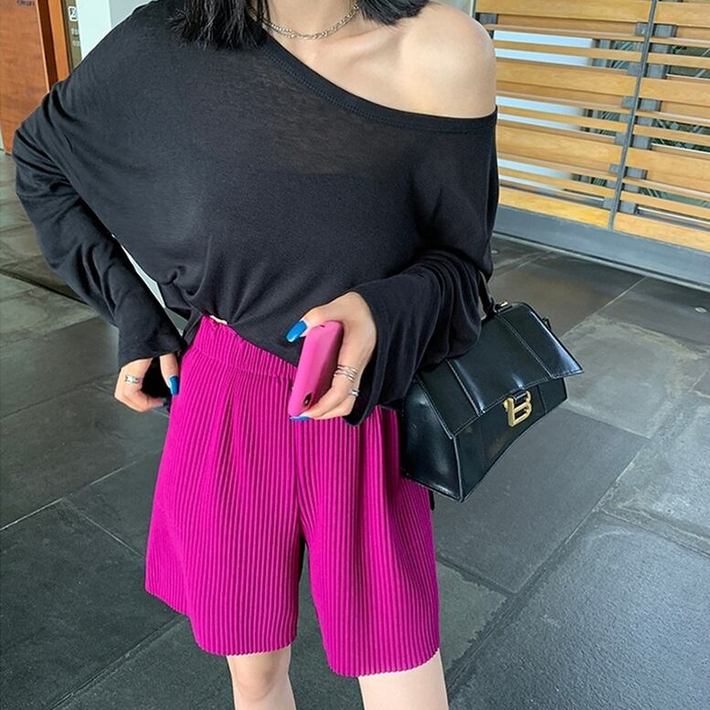着心地抜群の落ち感のある生地が魅力の細プリーツ加工のショートパンツ。Iラインが引き立ち脚長効果も期待できます。さらっとした着心地に体のラインを拾わないワイドシルエットも魅力です