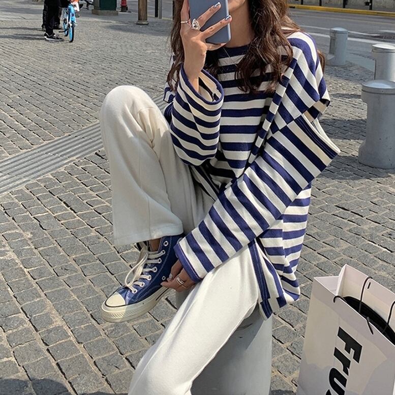 さりげない肌見せがポイントのボーダーTシャツ。ゆったりシルエットにオープンショルダーが女の子らしい印象です。ロングボトムともミニ丈ボトムともバランスよくスタイリングが仕上がります