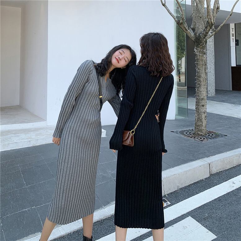 2color レディース リブニットロングペンシルワンピース ワンピース ドレス ひざ下 ミモレ丈 ロング 長袖 Vネック エレガント 大人可愛い きれいめ ナチュラル 上品 黒 ブラック グレー 美脚 脚長 高見え おしゃれ オシャレ お洒落 春夏 春 秋冬 秋 冬 オフィス 通勤 通学 二次会 デート お出かけ 普段使い 大人 かわいい 可愛い トレンド