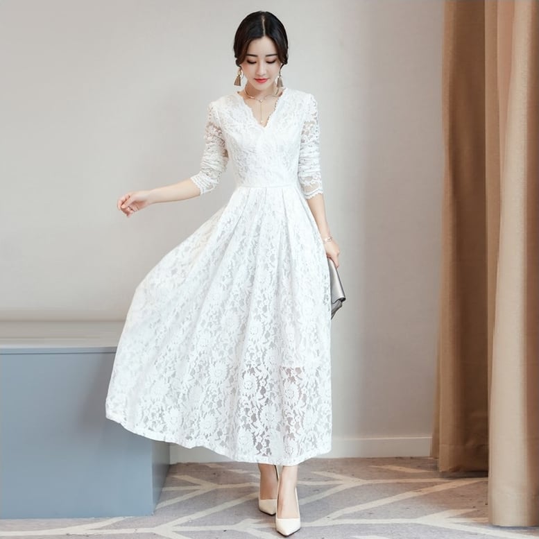 総レースなのでとっても華やかでドレッシーなロングワンピース。カシュクールのネックラインにハイウエストで脚長効果を発揮するスタイルUPアイテム。タックがしっかり施されスカートのラインが表情豊かで上品な印象を作ります