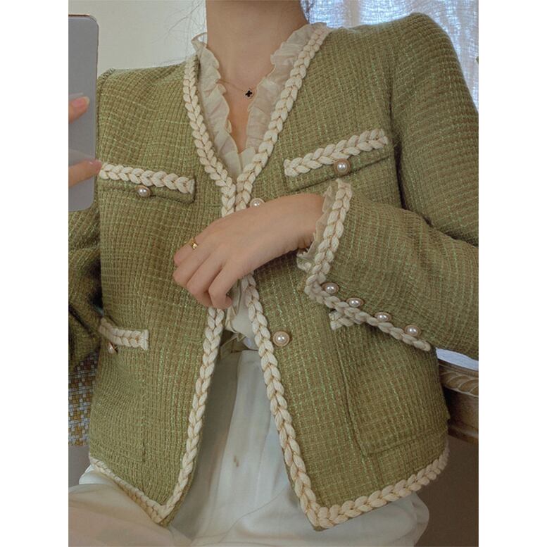 気軽に羽織れるレトロなデザインのミディアム丈ジャケット。パールボタンや編み込みのパイピングが上品な一枚です。ガーリーなスタイルはもちろん肩掛けしたりデニムでカジュアルダウンするのもおすすめです