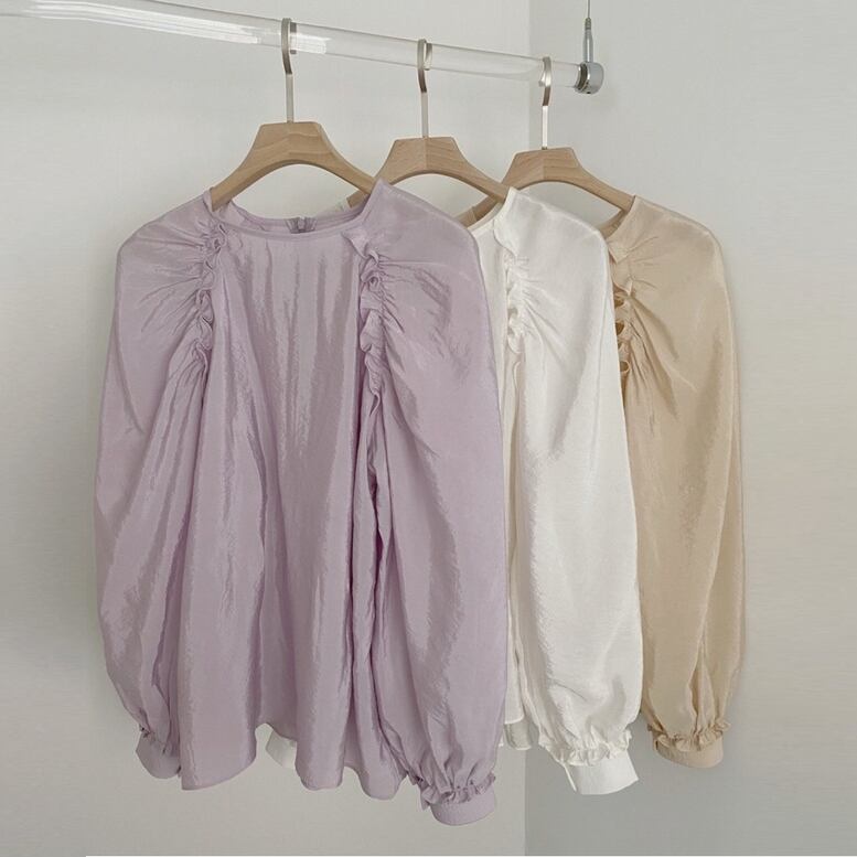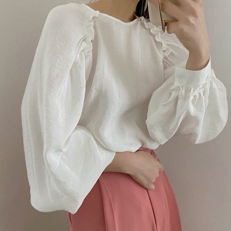 フェミニンコーデには欠かせないボリューム袖ブラウス。袖ぐりのフリルがロマンティックなアイテムです。ガーリーなミニスカートを合わせてもデニムで崩しても大人可愛いスタイルに仕上がります