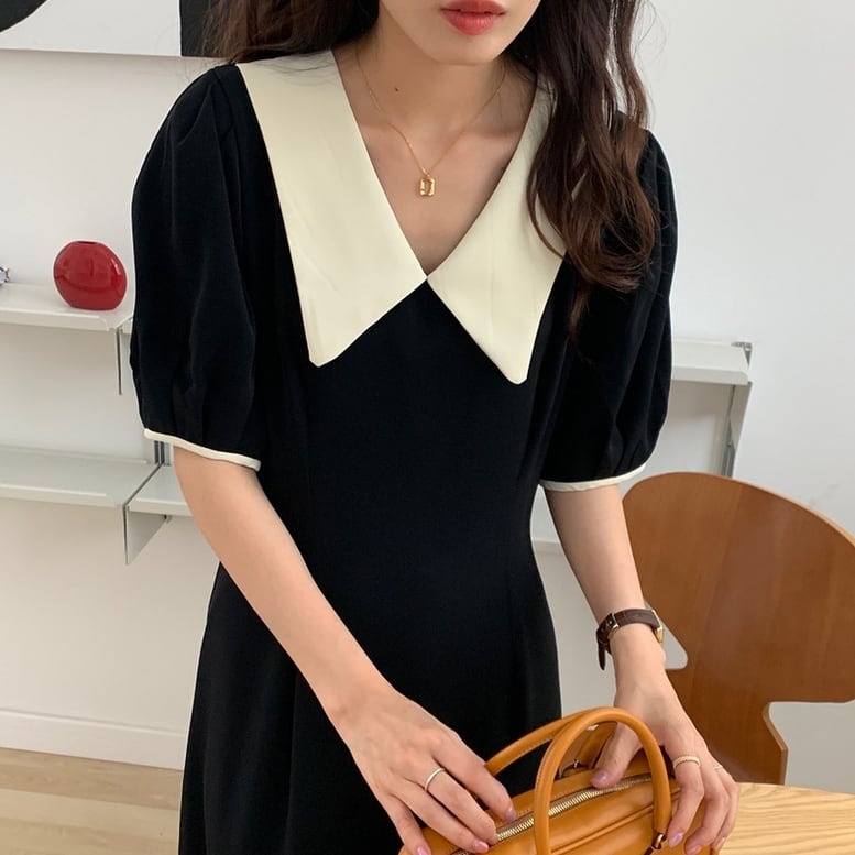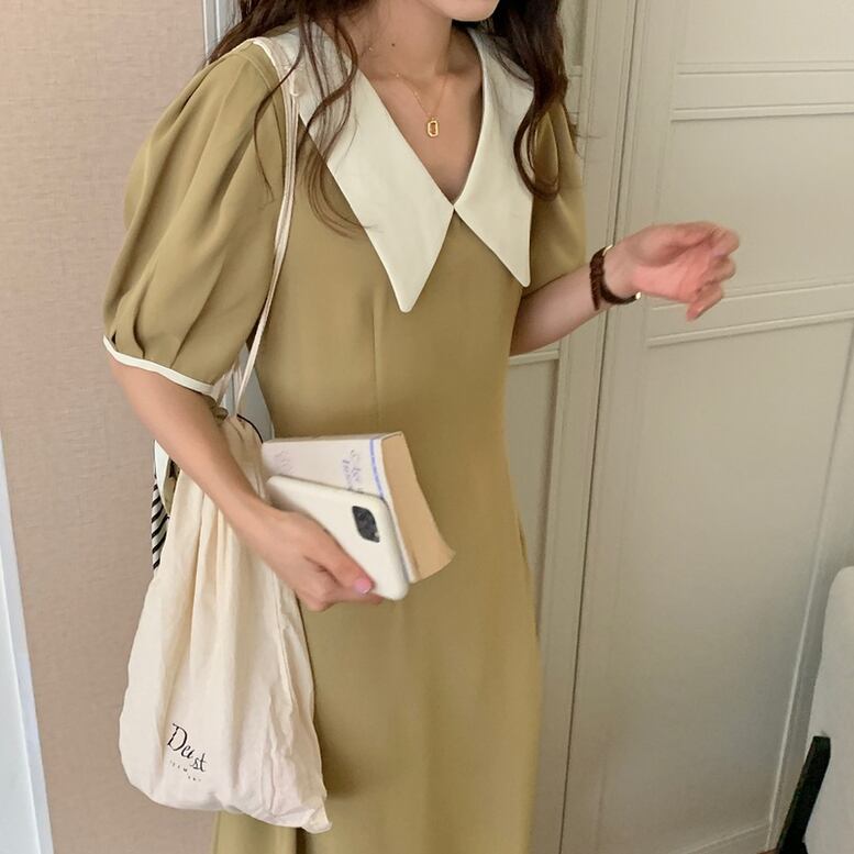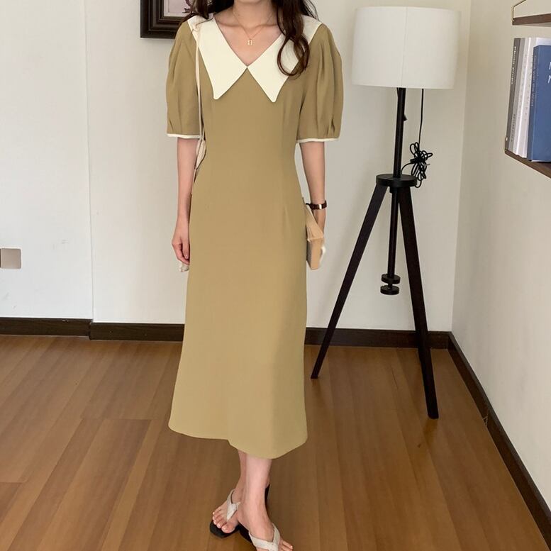 2color レディース パフスリーブビッグカラーミモレワンピース ワンピース ドレス dress シャツワンピース フレアワンピース ひざ下 ミモレ ロング丈 半袖 5分袖 ボリューム袖 パフスリーブ Vネック 襟付き エレガント 大人可愛い きれいめ ナチュラル 華やか 上品 レトロ クラシック キュート ガーリー オケージョン 二の腕カバー モテ 高見え おしゃれ 春夏 春 夏 秋冬 秋 オフィス 通勤 通学 パーティー 二次会 フォーマル ドレス デート お出かけ 大人 トレンド