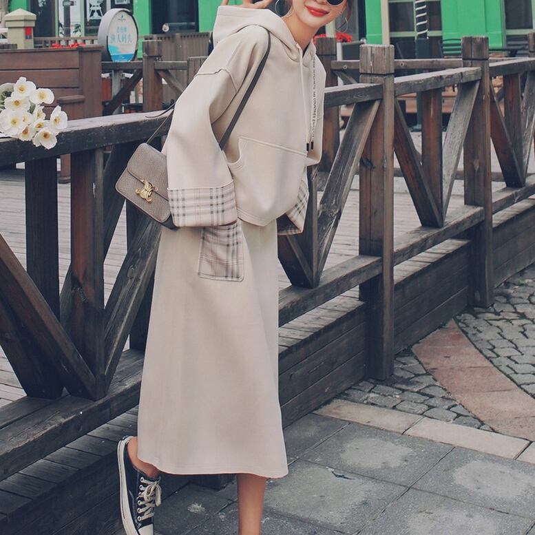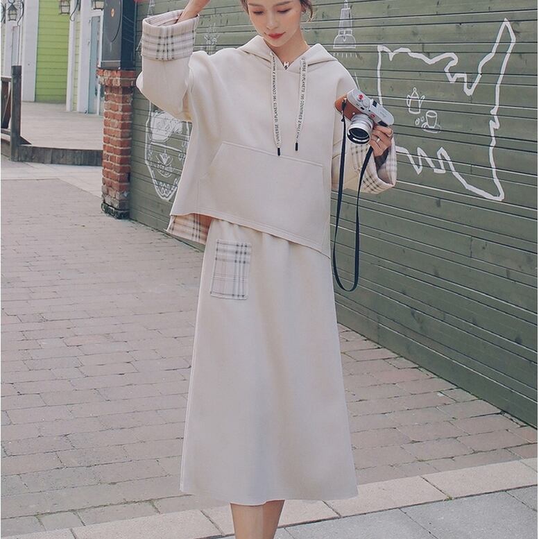 リラックス感のある大人カジュアルなパーカー×スカートセットアップ。ドロップショルダーのリラクシーなトップスと女性らしいバックスリットのスカートです。タータンチェックのワンポイントが魅力的なアイテム