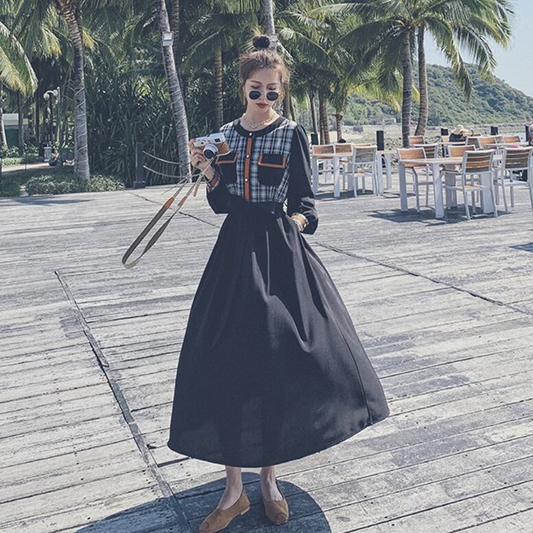 レディース チェック切り替えワンピース ドレス ハーフチェックラウンドネックフレアミモレドレス ポケット付きウエストリボンロングシャツワンピース dress フレアワンピース ひざ下 ミモレ丈 ロング 長袖 ドッキング フレア ウエストマーク リボン エレガント 大人可愛い きれいめ ナチュラル 華やか 上品 レトロ クラシック キュート ガーリー 黒 ブラック チェック柄 モテ インスタ映え おしゃれ 春夏 春 夏 秋冬 秋 冬 オフィス 通勤 通学 パーティー 二次会 ドレス デート お出かけ 大人